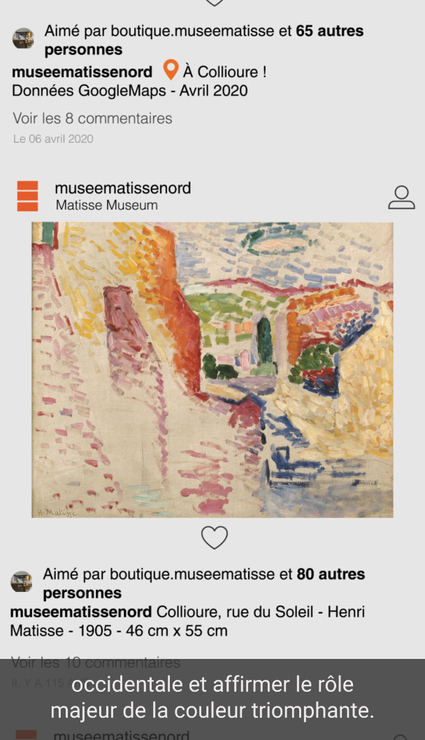 Le projet “1minute/1oeuvre” a été créé au début de la pandémie de Covid-19 dans le but de maintenir un lien entre le public et le musée. Le projet consiste en une série de courtes vidéos produites pour la plateforme de médias sociaux Instagram qui raconte l’histoire d’Henri Matisse et l’évolution de son style de peinture au fil du temps. Les vidéos mettent en scène un compte Instagram fictif avec des posts présentant les peintures de Matisse, chaque vidéo zoomant sur une peinture spécifique et fournissant une explication en voix off.
