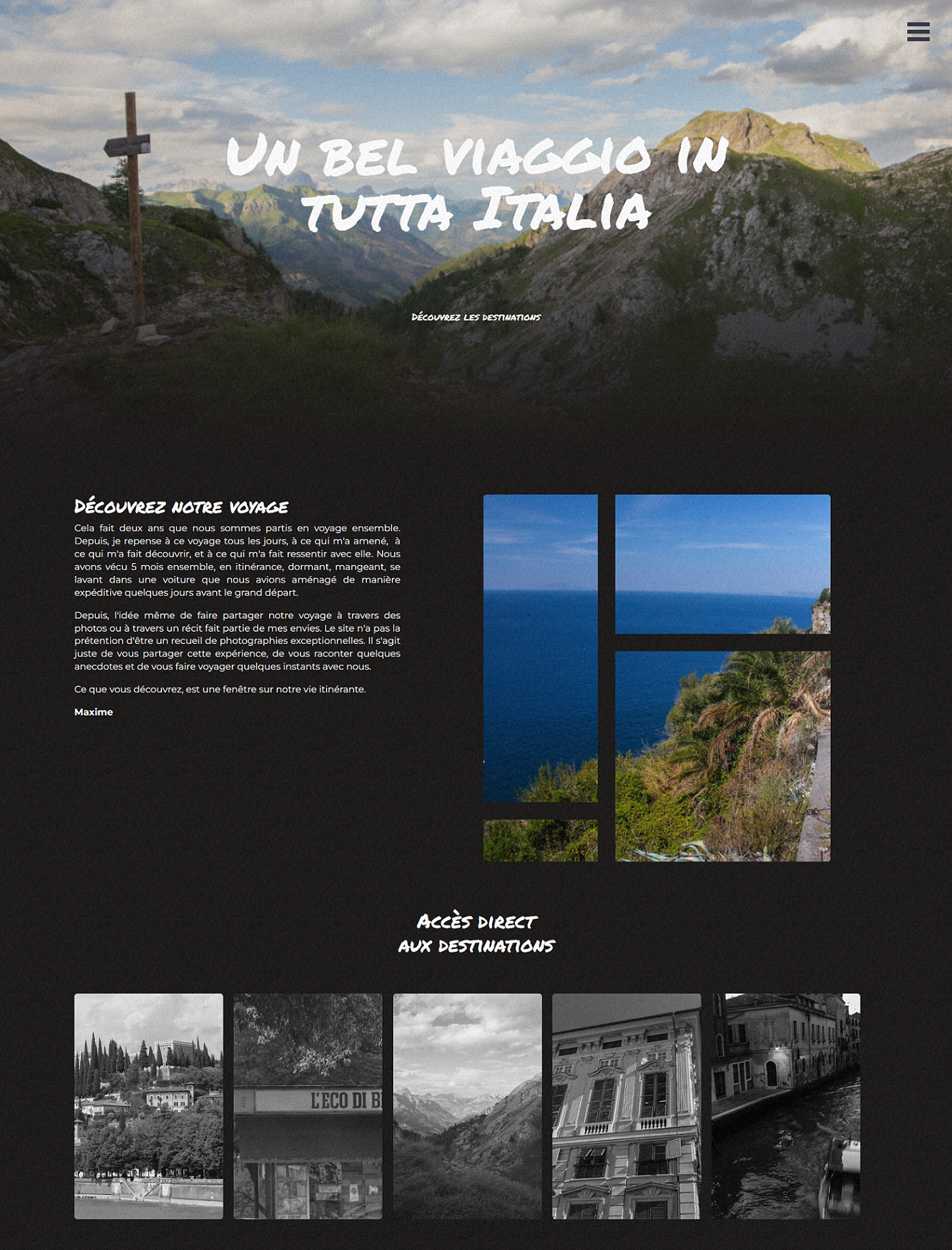 Le projet “Italian Adventure” est un site web hommage à mon premier long voyage en Italie, que j’ai effectué en 2018 avec ma copine. Nous avons passé quatre mois à voyager à travers toutes les régions d’Italie, du nord au sud, et nous avons dormi dans notre voiture pendant tout le voyage. Ce voyage a été une expérience incroyable et nous avons rencontré de nombreuses personnes merveilleuses en cours de route.