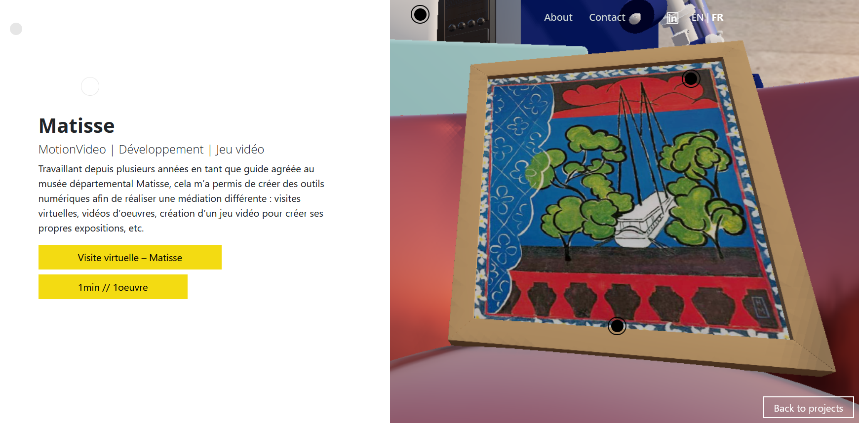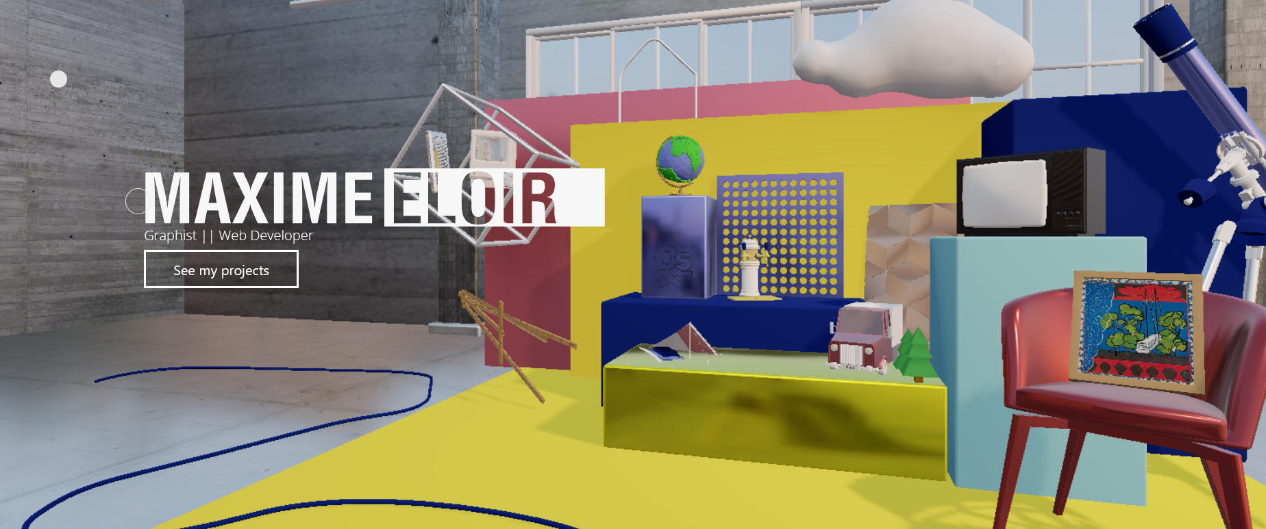 La page d’accueil, développée avec Three.js, m’a permis de créer un environnement 3D interactif intégrant des animations et des incrustations vidéo. L’ensemble est alimenté par une base de données WordPress, me permettant d’associer chaque projet à un point précis de mon environnement 3D.